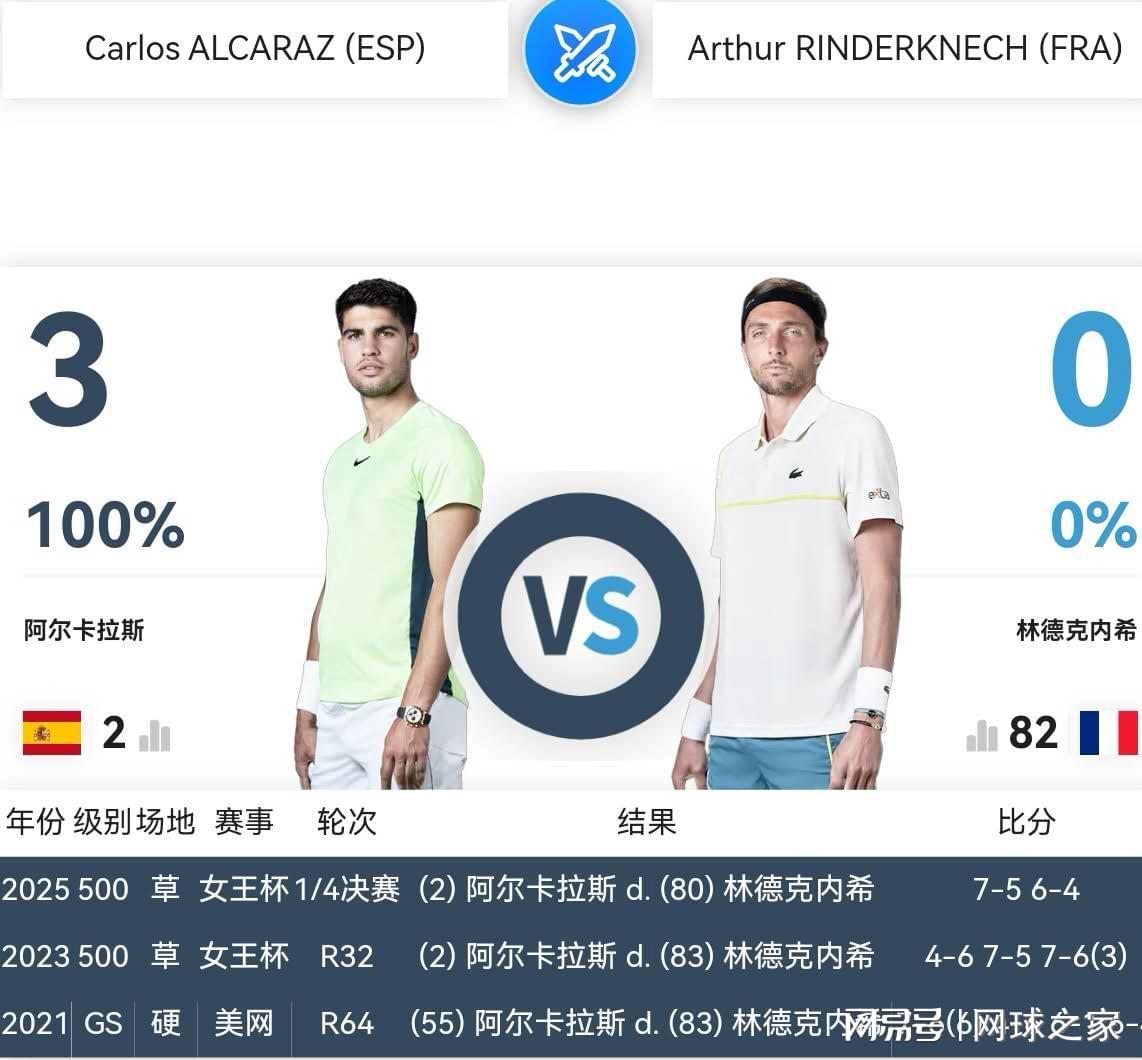2025年ATP500伦敦女王杯1/4决赛,两人职业生涯第三次交锋,阿尔卡拉斯不再像前两次那样输掉一盘,而是以7:5 6:4的比分两盘战胜林德克内希,最后第二次夺取女王杯冠军。